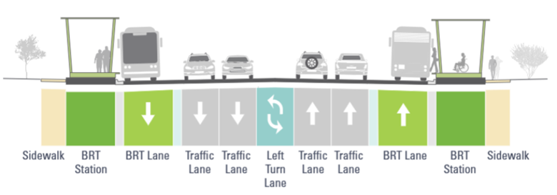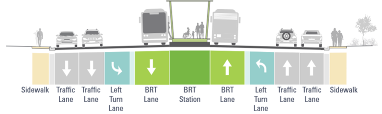 Unlike the side-running option, the center-running lane option will reserve a lane for BRT buses only. Other considerations include less roadway width and right-of-way impacts on neighbors. BRT stations will be in the center of the road, and left turns can only be made at one of the many signalized intersections along the corridor.