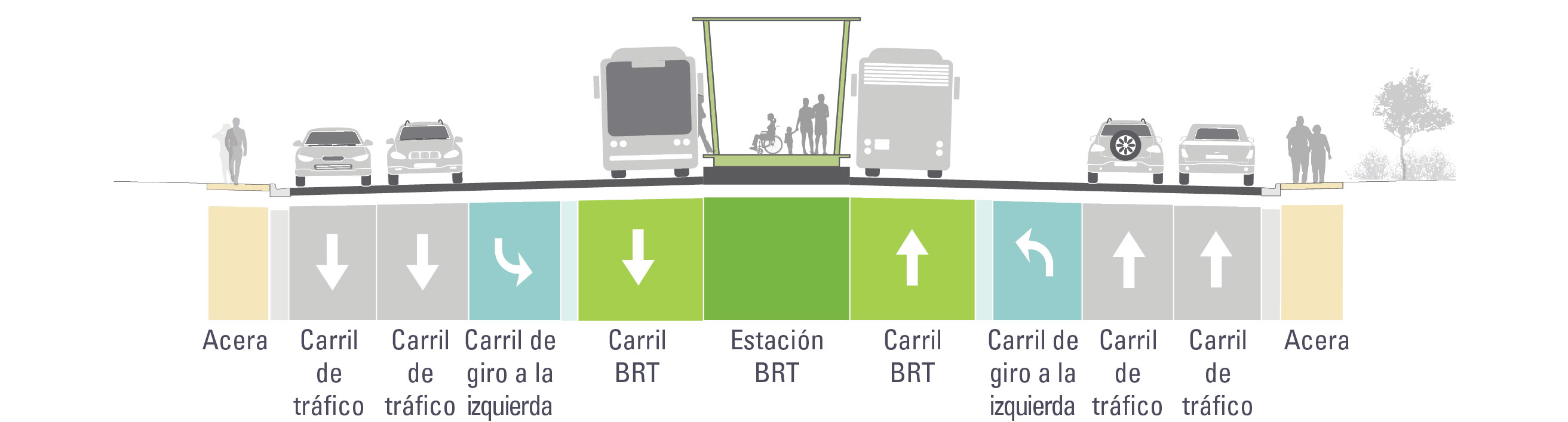 Local buses can use the BRT lane and general traffic can make right-turns from the BRT lane | Only BRT buses are allowed in the BRT lane |